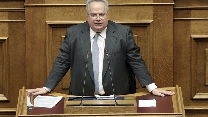 «Εδώ έχουμε δύο στρατόπεδα» είπε χαρακτηριστικά, «αυτούς που θέλουν λύση και αυτούς που είναι οπαδοί της αδράνειας και της εκκρεμότητας». Ενώ στις διαμαρτυρίες μελών του κόμματος της αξιωματικής αντιπολίτευσης, είπε ότι «κάποιοι δεν αντέχουν την αλήθεια». Αναφερόμενος στα διαπραγματευτικά πεπραγμένα της ΝΔ, ο υπουργός Εξωτερικών με την άδεια του Ανωτάτου Υπηρεσιακού Συμβουλίου του ΥΠΕΞ κατέθεσε στη Βουλή απόρρητα έγγραφα που αφορούσαν τις διαπραγματεύσεις που διεξήγαγε η ΝΔ για το Σκοπιανό.