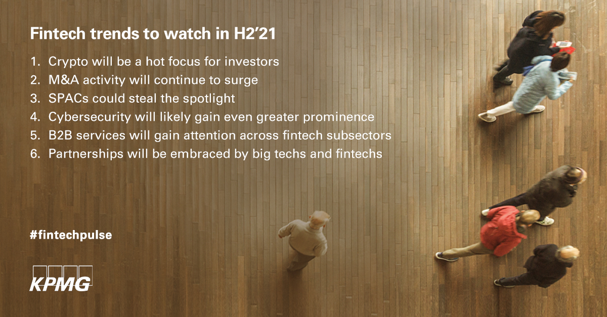Με το βλέμμα στο β’ εξάμηνο του 2021, οι συνολικές επενδύσεις στο Fintech αναμένεται να παραμείνουν ιδιαίτερα ισχυρές στις περισσότερες περιοχές του κόσμου. Ενώ ο τομέας των πληρωμών αναμένεται να παραμείνει κυρίαρχος μεταξύ των επενδύσεων στο Fintech, οι λύσεις χρηματοδότησης βάσει εσόδων, τα μοντέλα τραπεζικής ως υπηρεσίας και οι υπηρεσίες B2B αναμένεται να προσελκύσουν αυξημένα επίπεδα επενδύσεων. Δεδομένης της αύξησης των ψηφιακών συναλλαγών και της επακόλουθης αύξησης των κυβερνοεπιθέσεων και του ransomware, οι λύσεις κυβερνοασφάλειας πιθανόν να είναι επίσης ψηλά στο «ραντάρ» των επενδυτών.