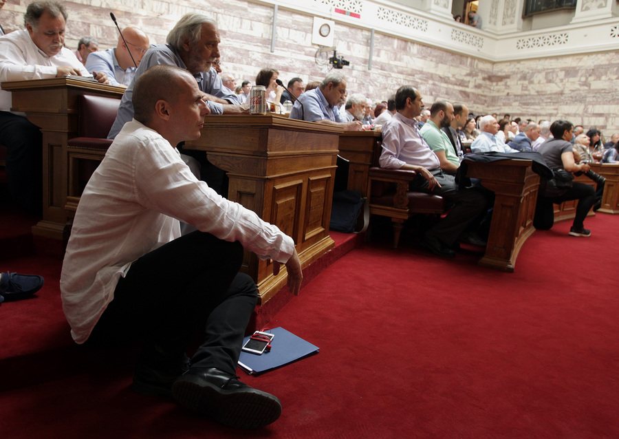 Καθισμένος στο πάτωμα της αίθουσας της Γερουσίας της Βουλής αντί τα έδρανα άκουσε σήμερα το μεσημέρι ο Γιάνης Βαρουφάκης την ομιλία του πρωθυπουργού Αλέξη Τσίπρα στην Κοινοβουλευτική Ομάδα του ΣΥΡΙΖΑ.