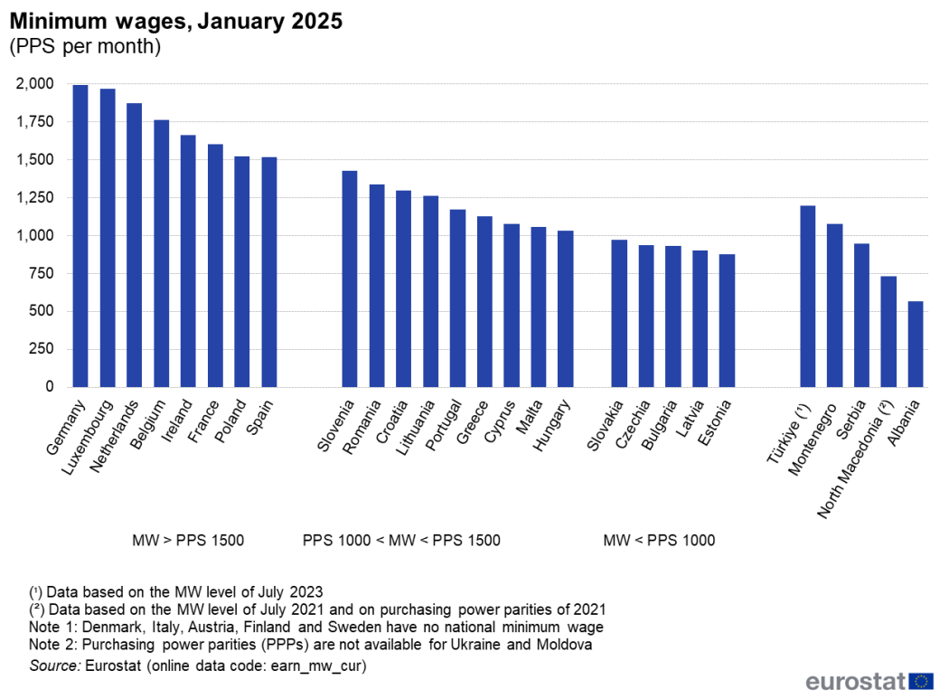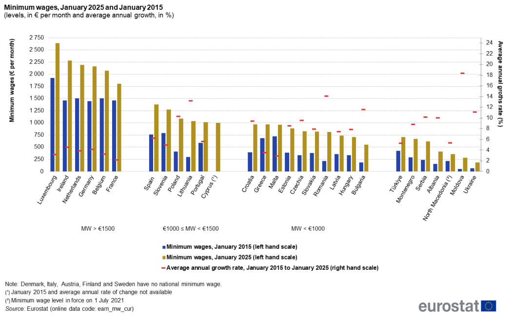Το υψηλότερο επίπεδο μέχρι την 1η Ιανουαρίου του 2025 ήταν στο Λουξεμβούργο (2.638 ευρώ) και το χαμηλότερο στη Βουλγαρία (551 ευρώ).