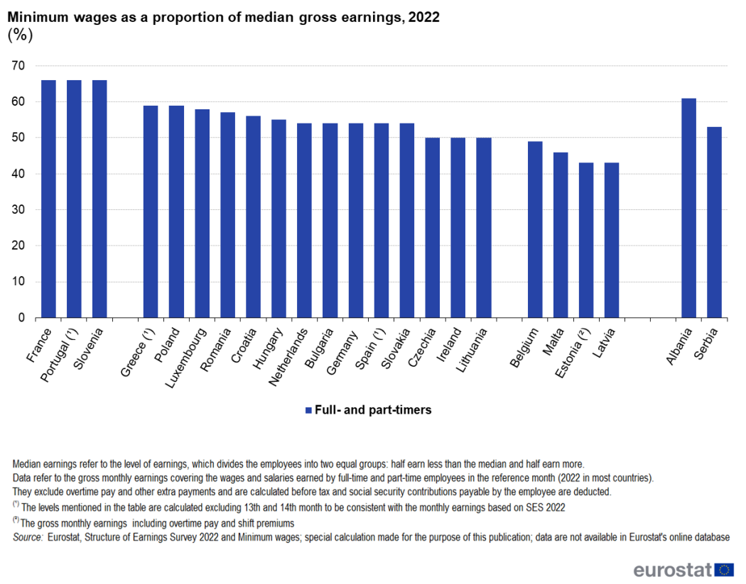Στη συνέχεια, η Eurostat κατέγραψε τους κατώτατους μισθούς ανά την ΕΕ σε αναλογία με τις διαμέσες ακαθάριστες αποδοχές (στοιχεία για το 2022).
