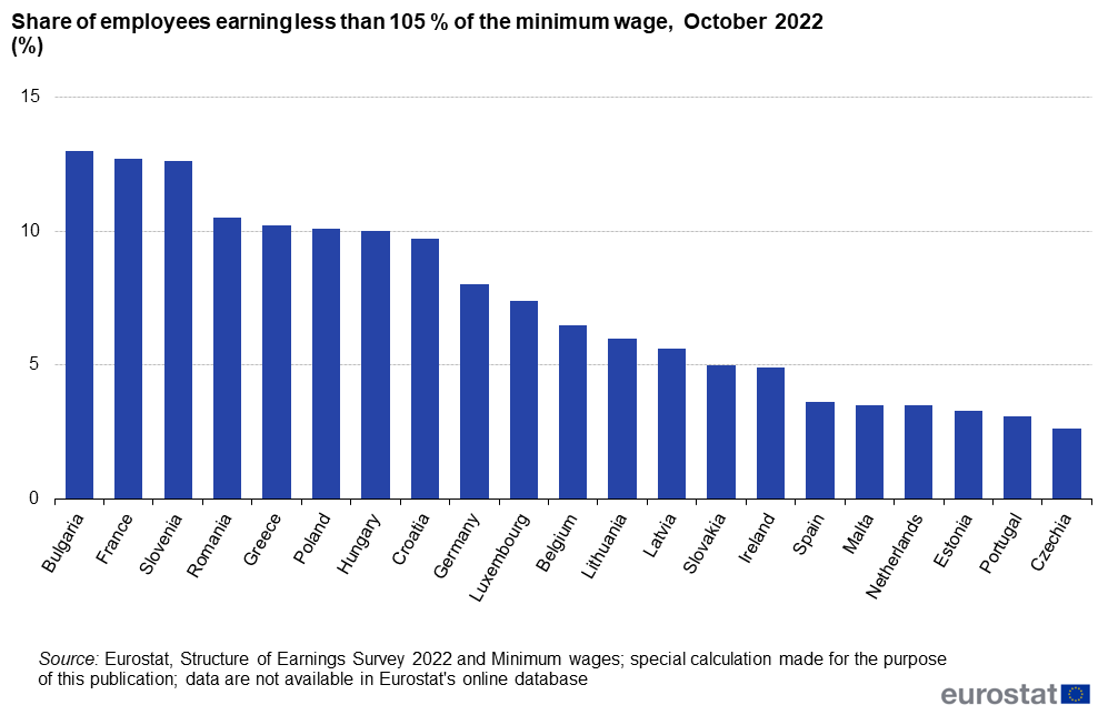 Αναλυτικά, το 2022 το ποσοστό των μισθωτών που αμείβονταν με μισθό μικρότερο από το 105% του εθνικού κατώτατου μισθού ήταν πάνω από 10% σε 7 χώρες της ΕΕ με κατώτατο μισθό: Βουλγαρία (13,0%), Γαλλία (12,7%), Σλοβενία (12,6%), Ρουμανία (10,5%), Ελλάδα (10,2%), Πολωνία (10,1%) και Ουγγαρία (10,0%).