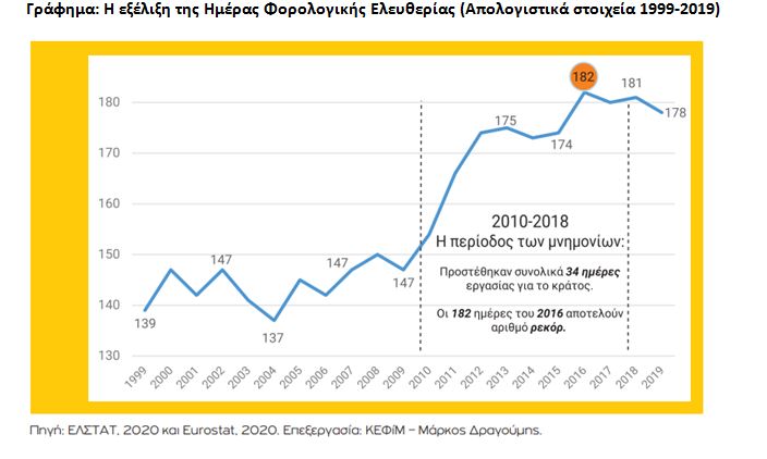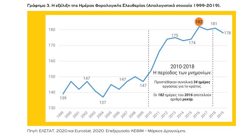 - Η χειρότερη επίδοση της Ελλάδας ως προς την Ημέρα Φορολογικής Ελευθερίας σημειώθηκε το 2016, όταν χρειάστηκαν 182 ημέρες εργασίας για να χρηματοδοτηθούν οι ανάγκες του κράτους.