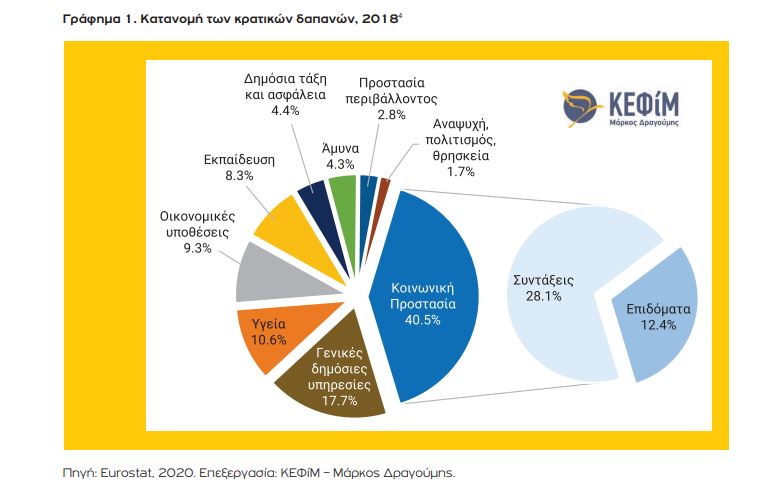 - Το κράτος δαπάνησε το 2018 το 40,5% των συνολικών του εσόδων στην κοινωνική προστασία. Το μεγαλύτερο μέρος αυτών των χρημάτων (28,1% των συνολικών εσόδων) αφορούσε συντάξεις γήρατος. Το ποσοστό αυτό είναι το μεγαλύτερο σε όλες τις χώρες της ΕΕ, 6,1 ποσοστιαίες μονάδες πάνω από τον ευρωπαϊκό μέσο όρο.
