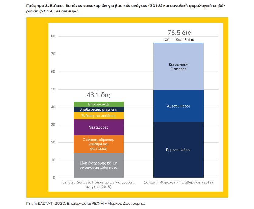 - Η συνολική επιβάρυνση πολιτών και επιχειρήσεων από φόρους και εισφορές το 2019 (76,5 δις ευρώ) είναι σχεδόν διπλάσια από το ποσό που κατέβαλαν τα νοικοκυριά την προηγούμενη χρονιά (43,1 δις ευρώ το 2018) για την κάλυψη των βασικών τους αναγκών (διατροφή, ένδυση, στέγαση, οικιακά αγαθά, μεταφορές και επικοινωνίες).