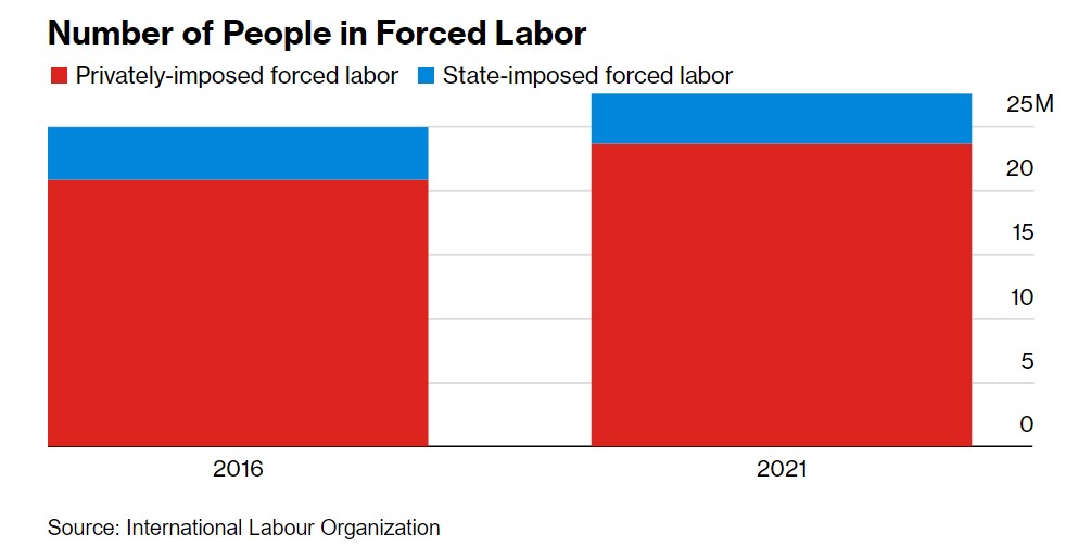 Περίπου 27,6 εκατομμύρια άνθρωποι βρέθηκαν σε καθεστώς καταναγκαστικής εργασίας «κάθε μέρα του 2021», ανέφερε η ΔΟΕ. «Αυτός ο αριθμός μεταφράζεται σε 3,5 άτομα για κάθε χίλια άτομα στον κόσμο».