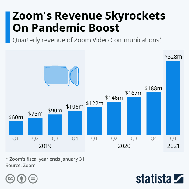 Το Zoom, που είδε τα έσοδά του να απογειώνονται 170% το πρώτο τρίμηνο, βλέπει επίσης τη μετοχή του να επιδίδεται σε ξέφρενο ράλι. Από την αρχική δημόσια εγγραφή πέρυσι έως σήμερα η αξία της έχει ενισχυθεί κατά 484% χαρίζοντας έτσι υπερκέρδη σε όσους επένδυσαν σε αυτήν με την είσοδό της στο χρηματιστήριο.