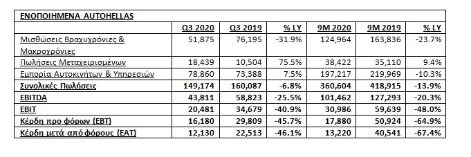 Κατά το 3ο τρίμηνο 2020, που λόγω εποχικότητας είναι πάντα το πιο σημαντικό στην διαμόρφωση της κερδοφορίας, η Autohellas κατέγραψε πωλήσεις σε ενοποιημένο επίπεδο €149.2.εκ. μειωμένες κατά 7% από το 2019, EBITDA ύψους €43.8εκ. και Κέρδη μετά φορών €12,1εκ. μειωμένα κατά 46% από το 2019. Η προσθήκη της δραστηριότητας του τρίτου τρίμηνου οδήγησε το εννεάμηνο στα €360.6 εκ. πωλήσεις, το EBITDA στα €101.5 εκ. και τα Κέρδη μετά φόρων στα €13.2 εκ. μειωμένα κατά 67% από το 2019.