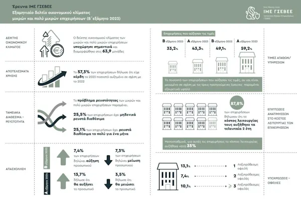 Από την άλλη μεριά, τα σοβαρά προβλήματα ρευστότητας που αντιμετωπίζουν οι μικρές και πολύ μικρές επιχειρήσεις παραμένουν, ενώ οι επιπτώσεις από το πληθωριστικό κύμα των τελευταίων 2 περίπου ετών είναι εμφανείς στην αύξηση του λειτουργικού κόστους των επιχειρήσεων, το οποίο με βάση τα ευρήματα της έρευνας έχει αυξηθεί μεσοσταθμικά κατά 35%.