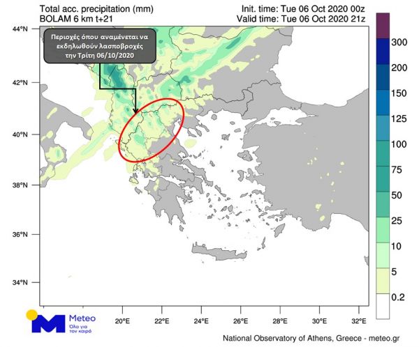 Επιπροσθέτως, όπως φαίνεται στο χάρτη που ακολουθεί, κατά τη διάρκεια της Τρίτης 06/10 βροχές οι οποίες θα έχουν χαρακτήρα λασποβροχών αναμένεται να εκδηλωθούν σε περιοχές της δυτικής, κεντρικής και βόρειας χώρας, με πιο γενικευμένα φαινόμενα στα βορειοδυτικά.