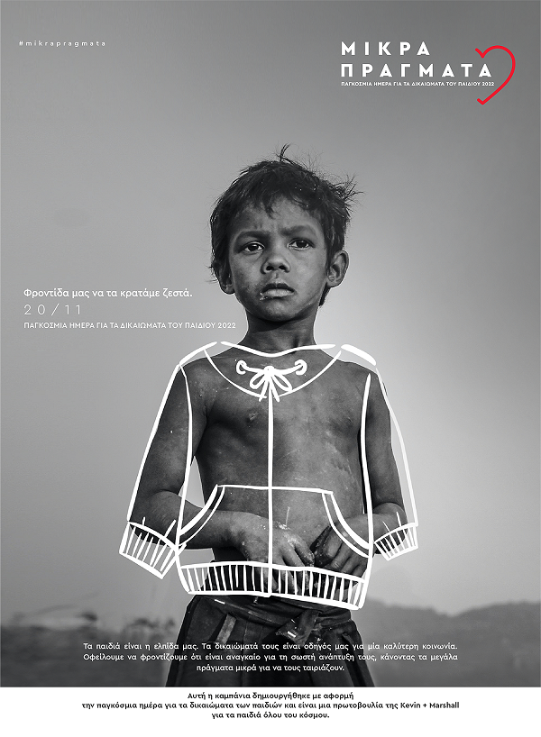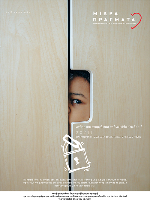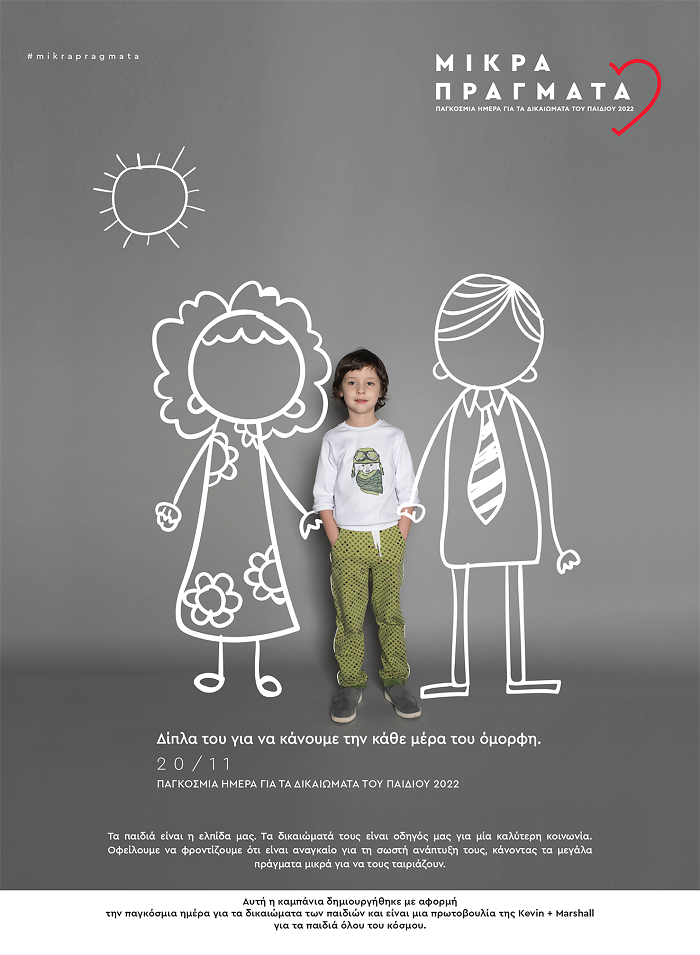 Με αφορμή την Παγκόσμια Ημέρα για τα δικαιώματα του παιδιού, σχεδίασε και υλοποίησε μια καμπάνια που έχει σαν στόχο το awareness και την ευαισθητοποίηση του κοινού για ένα ζήτημα που μοιάζει πιο επίκαιρο από ποτέ. Δίνοντας έμφαση στο θέμα της οικογένειας, της ενδοοικογενειακής βίας και της φτώχειας, σκοπός της είναι να αναδείξει αυτές τις τρεις θεματικές που η καθεμία τους παρουσιάζει ξεχωριστό ενδιαφέρον. Τα μικρά πράγματα για εμάς, τα δεδομένα, είναι πράγματα μεγάλης αξίας για τα παιδιά και αυτό είναι το μήνυμα που πρέπει να περάσει στον κόσμο. Να κοιτάξουμε όλοι μας μέσα από τα μάτια των παιδιών, να μπούμε στη θέση τους και να καταλάβουμε τη διαφορετική πραγματικότητα στην οποία ζουν.