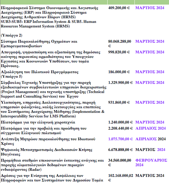 Σύστημα Παρακολούθησης Οχημάτων και Εμπορευματοκιβωτίων, Ανάπτυξη Μητρώου Παρακολούθησης του Ιδιωτικού Χρέους, Προμήθεια σταθμών επικοινωνιών έκτακτης ανάγκης και παροχής κλιματολογικών δεδομένων περιοχών ενδιαφέροντος (Radar), Πλατφόρμα για την ελληνική χειροτεχνία, αλλά και Πλατφόρμα για την προβολή και προώθηση του σύγχρονου ελληνικού πολιτισμού, είναι ορισμένα από τα έργα που θα προκηρυχθούν από την Κοινωνία της Πληροφορίας τους επόμενους δύο με τρεις μήνες.