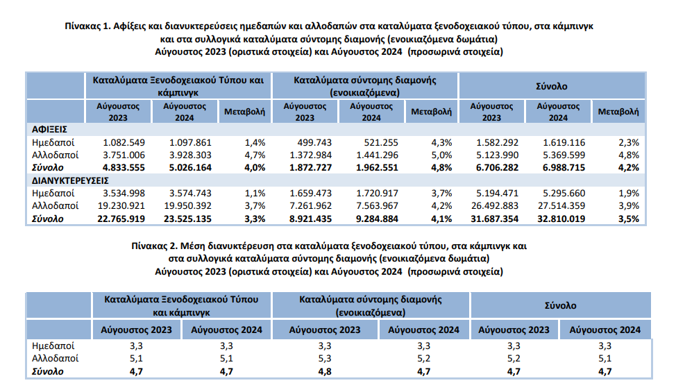 Κατά τον μήνα Αύγουστο 2024 οι αφίξεις στα τουριστικά καταλύματα ανήλθαν σε 6.988.715 και οι διανυκτερεύσεις σε 32.810.019, σημειώνοντας αύξηση σε σύγκριση με τον αντίστοιχο μήνα του έτους 2023, κατά 4,2% στις αφίξεις και 3,5% στις διανυκτερεύσεις.
