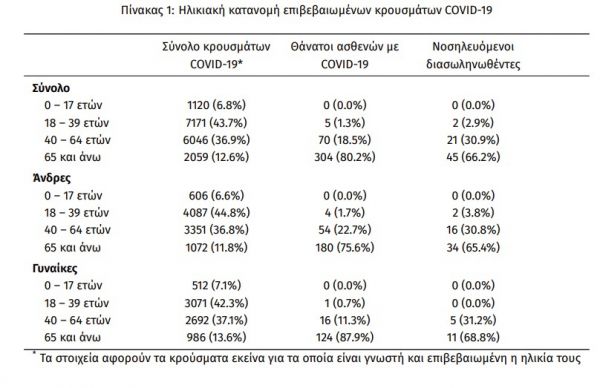 Τέλος, έχουμε τρεις ακόμα καταγεγραμμένους θανάτους και 379 θανάτους συνολικά στη χώρα. 142 (37.5%) είναι γυναίκες και οι υπόλοιποι άνδρες. Η διάμεση ηλικία των θανόντων συμπολιτών μας ήταν τα 78 έτη και το 96.6% είχε κάποιο υποκείμενο νόσημα ή/και ηλικία 70 ετών και άνω.