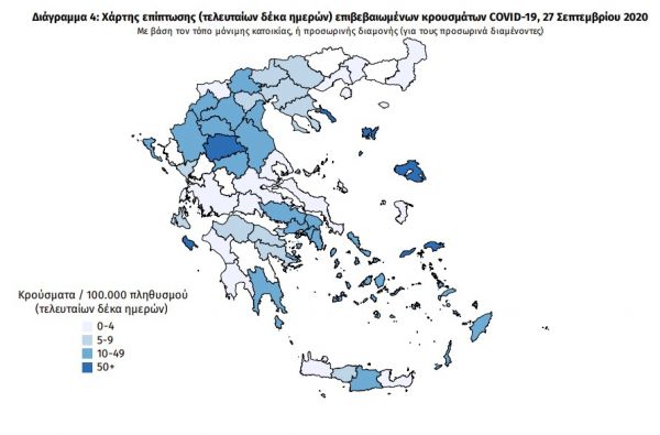 Ο χάρτης αποτυπώνει τη γεωγραφική κατανομή των συνολικών κρουσμάτων COVID-19 (από την αρχή της επιδημίας) ανά Περιφερειακή Ενότητα της χώρας, με βάση την δηλωθείσα διεύθυνση μόνιμης κατοικίας του ασθενούς, ή τη διεύθυνση προσωρινής διαμονής για τους τουρίστες και άλλους προσωρινά διαμένοντες στην Ελλάδα.