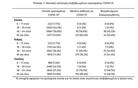 Η διάμεση ηλικία των θανόντων συμπολιτών μας ήταν τα 79 έτη και το 96.3% είχε κάποιο υποκείμενο νόσημα ή/και ηλικία 70 ετών και άνω.