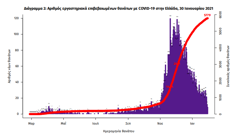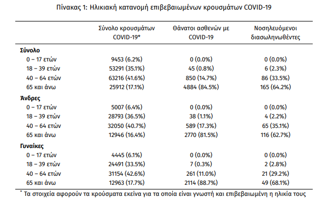 Τέλος, έχουμε 15 νέους θανάτους από τη νόσο COVID-19, φθάνοντας τους 5779 θανάτους συνολικά στη χώρα, εκ των οποίων 3397 (58.8%) άνδρες. Η διάμεση ηλικία των θανόντων συμπολιτών μας ήταν τα 79 έτη και το 95.5% είχε κάποιο υποκείμενο νόσημα ή/και ηλικία 70 ετών και άνω.