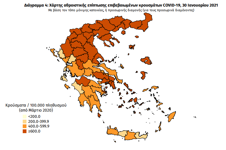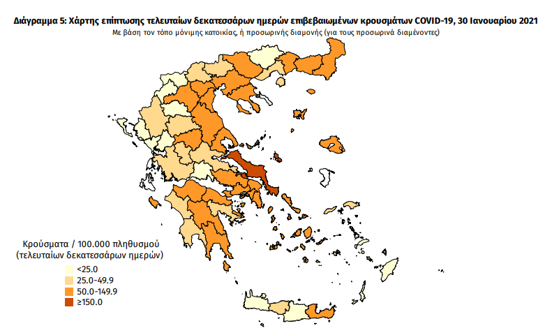 Ο χάρτης αποτυπώνει τη γεωγραφική κατανομή των συνολικών κρουσμάτων COVID-19 (από την αρχή της επιδημίας) ανά Περιφερειακή Ενότητα της χώρας, με βάση την δηλωθείσα διεύθυνση μόνιμης κατοικίας του ασθενούς, ή τη διεύθυνση προσωρινής διαμονής για τους τουρίστες και άλλους προσωρινά διαμένοντες στην Ελλάδα. Συμπεριλαμβάνονται τόσο κρούσματα με ιστορικό ταξιδίου («εισαγόμενα») όσο και κρούσματα με πιθανή εγχώρια μετάδοση.