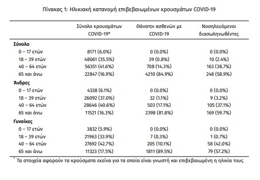 Η διάμεση ηλικία των κρουσμάτων είναι 44 έτη (εύρος 0,2 έως 104 ετών), ενώ η διάμεση ηλικία των θανάτων είναι 79 έτη (εύρος 24 έως 103 ετών). Η ηλικιακή κατανομή των (α) συνολικών κρουσμάτων, (β) των περιστατικών που κατέληξαν σε θάνατο και (γ) των ασθενών που νοσηλεύονται διασωληνωμένοι, είναι η ακόλουθη: