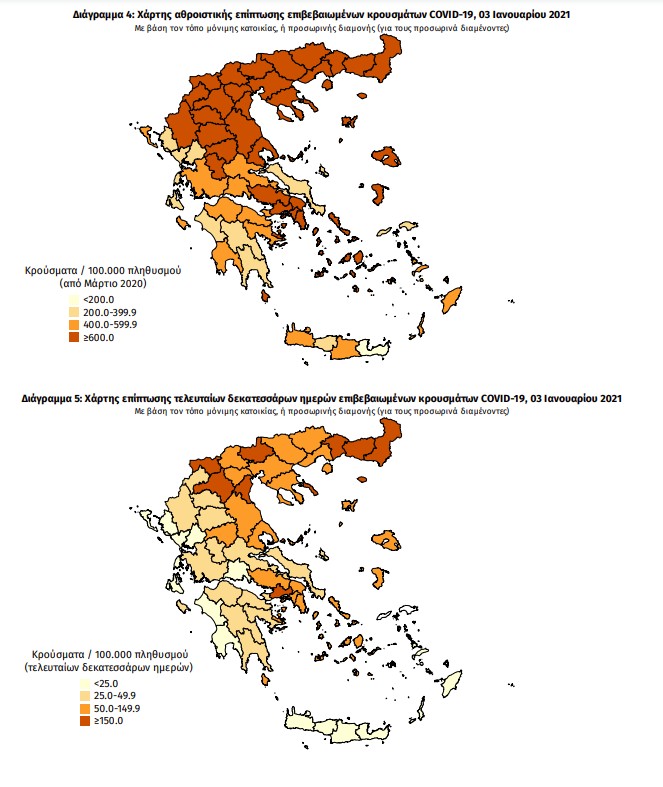 Ο χάρτης αποτυπώνει τη γεωγραφική κατανομή των συνολικών κρουσμάτων COVID-19 (από την αρχή της επιδημίας) ανά Περιφερειακή Ενότητα της χώρας, με βάση την δηλωθείσα διεύθυνση μόνιμης κατοικίας του ασθενούς, ή τη διεύθυνση προσωρινής διαμονής για τους τουρίστες και άλλους προσωρινά διαμένοντες στην Ελλάδα. Συμπεριλαμβάνονται τόσο κρούσματα με ιστορικό ταξιδίου («εισαγόμενα») όσο και κρούσματα με πιθανή εγχώρια μετάδοση.