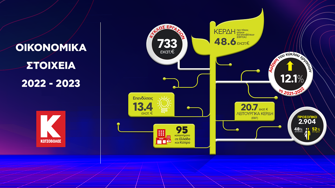 Με ενισχυμένα μερίδια αγοράς σε Ελλάδα και Κύπρο και θετικά οικονομικά αποτελέσματα έκλεισε για την Κωτσόβολος το οικονομικό έτος 2022–2023, το οποίο ολοκληρώθηκε στις 30 Απριλίου. Ο κύκλος εργασιών έκλεισε στα €733 εκ., σημειώνοντας σημαντική αύξηση της τάξεως του 12.1%, σε σχέση με το οικονομικό έτος 2021-2022. Tα κέρδη προ τόκων, φόρων και αποσβέσεων (EBITDA) έφτασαν τα €48.6 εκ., από €51.7 εκ. το προηγούμενο έτος. Τα λειτουργικά κέρδη (EBIT) ανήλθαν στα €20.7 εκ., από €25.2 εκ. το 2021-2022, παρουσιάζοντας μείωση, λόγω των ισχυρών πληθωριστικών πιέσεων σε όλες –ανεξαιρέτως – τις γραμμές κόστους, συμπεριλαμβανομένης της αύξησης στο κόστος πωληθέντων. Οι επενδύσεις για το συγκεκριμένο οικονομικό έτος έφτασαν τα €13.4 εκ., έναντι €13.3 εκ. το 2021-2022, ενώ τα ταμειακά διαθέσιμα έκλεισαν στα €82.8 εκ. έναντι €59.4 εκ. το 2021-2022, σημειώνοντας αύξηση της τάξεως του 39.4%.