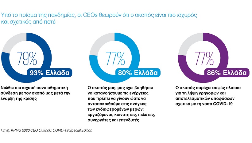 Σύμφωνα με την έρευνα KPMG 2020 CEO Outlook COVID-19 special edition οι επικεφαλής των εταιρειών χρειάστηκε να αναπροσαρμόσουν τις προτεραιότητές τους, με πολλούς να εστιάζουν στα πιο σπουδαία θέματα – την υγεία και την ευημερία των ανθρώπων τους και των κοινωνιών που δραστηριοποιούνται οι επιχειρήσεις τους. Με τη συγκυρία της πανδημίας στην αγορά, οι CEOs αναλαμβάνουν αποφασιστικές δράσεις σε όλο το εύρος των επιχειρήσεων τους, επιταχύνοντας τον ψηφιακό μετασχηματισμό της εταιρείας τους και εργάζονται για να διασφαλίσουν ότι το διαθέσιμο ταλαντούχο ανθρώπινο δυναμικό τους είναι ικανό να προσαρμοστεί στις νέες απαιτήσεις. Ανανεώνουν ή αναθεωρούν τον εταιρικό σκοπό τους ώστε οι επιχειρήσεις τους να είναι σε θέση να συνεισφέρουν λύσεις στις προκλήσεις που αντιμετωπίζει ο πλανήτης.