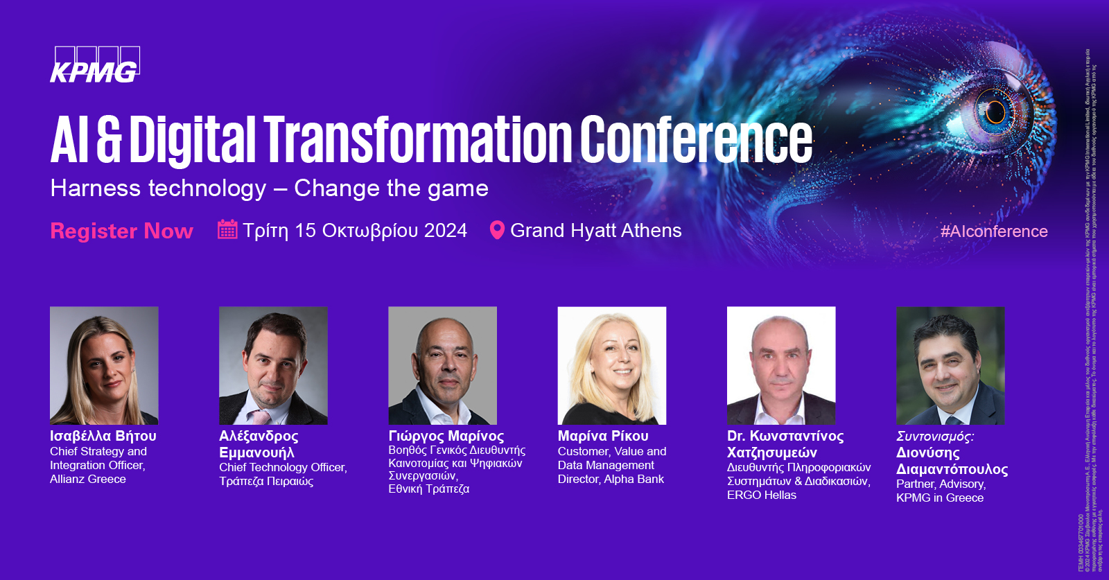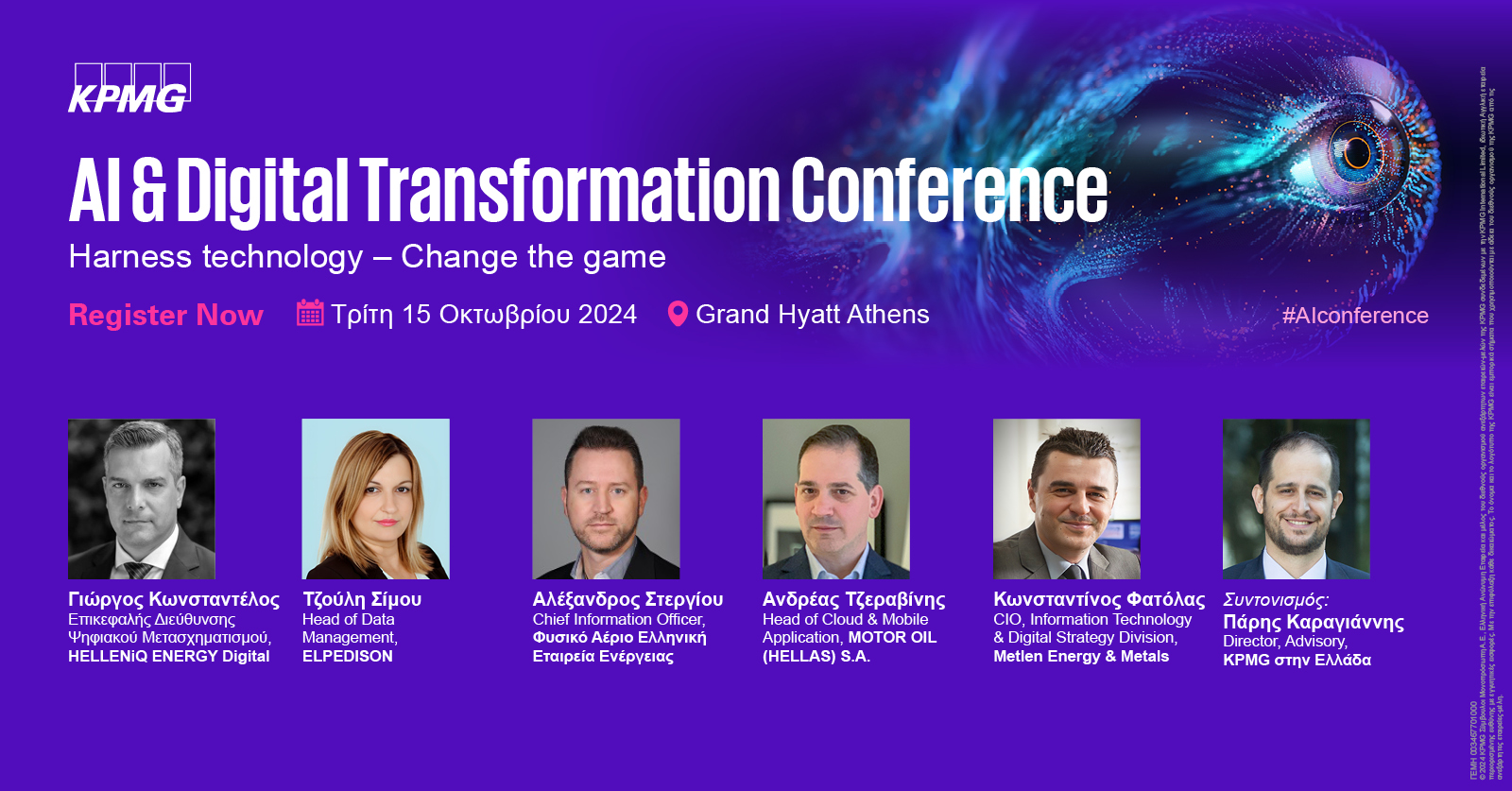 Το AI & Digital Transformation Conference της KPMG στην Ελλάδα έρχεται την Τρίτη 15 Οκτωβρίου, με κεντρικό μήνυμα “Harness Technology – Change the Game”, για να καλωσορίσει κορυφαία στελέχη – CIO, CTO, COO, CDO, CFO, CMO από την Ελλάδα και το εξωτερικό – σε μια συναρπαστική ημέρα συζητήσεων, παρουσιάσεων, ανταλλαγής απόψεων και networking με επίκεντρο το AI και τις νέες τεχνολογίες.