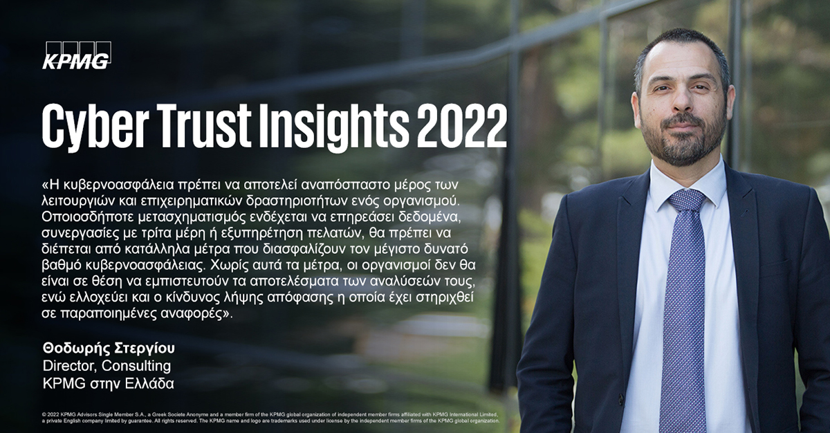 Με αφορμή τα ευρήματα, ο Θοδωρής Στεργίου, Director, Consulting της KPMG στην Ελλάδα σχολιάζει «Η κυβερνοασφάλεια πρέπει να αποτελεί αναπόσπαστο μέρος των λειτουργιών και επιχειρηματικών δραστηριοτήτων ενός οργανισμού. Οποιοσδήποτε μετασχηματισμός ενδέχεται να επηρεάσει δεδομένα, συνεργασίες με τρίτα μέρη ή εξυπηρέτηση πελατών, θα πρέπει να διέπεται από κατάλληλα μέτρα που διασφαλίζουν τον μέγιστο δυνατό βαθμό κυβερνοασφάλειας. Χωρίς αυτά τα μέτρα, οι οργανισμοί δεν θα είναι σε θέση να εμπιστευτούν τα αποτελέσματα των αναλύσεών τους, ενώ ελλοχεύει και ο κίνδυνος λήψης απόφασης η οποία έχει στηριχθεί σε παραποιημένες αναφορές».