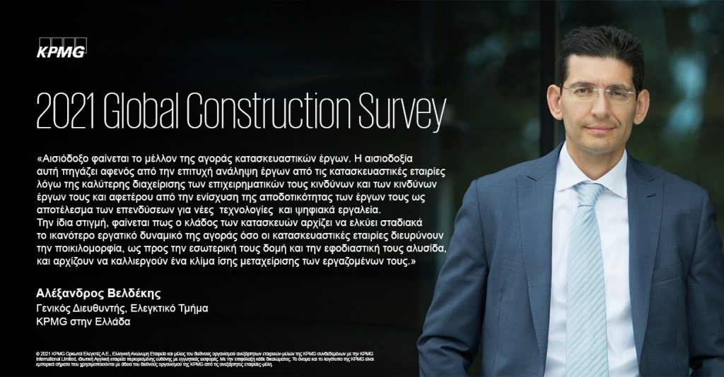 Επιπλέον, ο Αλέξανδρος Βελδέκης, γενικός διευθυντής, Ελεγκτικές Υπηρεσίες, KPMG στην Ελλάδα σημειώνει: «Αισιόδοξο φαίνεται το μέλλον της αγοράς κατασκευαστικών έργων. Η αισιοδοξία αυτή πηγάζει αφενός από την επιτυχή ανάληψη έργων από τις κατασκευαστικές εταιρίες λόγω της καλύτερης διαχείρισης των επιχειρηματικών τους κινδύνων και των κινδύνων έργων τους και αφετέρου από την ενίσχυση της αποδοτικότητας των έργων τους ως αποτέλεσμα των επενδύσεων για νέες τεχνολογίες και ψηφιακά εργαλεία. Την ίδια στιγμή, φαίνεται πως ο κλάδος των κατασκευών αρχίζει να ελκύει σταδιακά το ικανότερο εργατικό δυναμικό της αγοράς όσο οι κατασκευαστικές εταιρίες διευρύνουν την ποικιλομορφία, ως προς την εσωτερική τους δομή και την εφοδιαστική τους αλυσίδα, και αρχίζουν να καλλιεργούν ένα κλίμα ίσης μεταχείρισης των εργαζομένων τους».