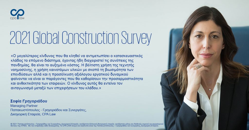 Σχολιάζοντας τα αποτελέσματα της έρευνας, η Σοφία Γρηγοριάδου, Managing Partner Παπακωστόπουλος – Γρηγοριάδου και Συνεργάτες Δικηγορική εταιρεία (CPA Law), ανεξάρτητο μέλος του διεθνούς δικτύου νομικών και φορολογικών υπηρεσιών της KPMG αναφέρει: «Ο μεγαλύτερος κίνδυνος που θα κληθεί να αντιμετωπίσει ο κατασκευαστικός κλάδος το επόμενο διάστημα, έχοντας ήδη διαχειριστεί τις συνέπειες της πανδημίας, θα είναι το αυξημένο κόστος. Η βέλτιστη χρήση της τεχνητής νοημοσύνης, η χρήση καινοτόμων υλικών με σκοπό τη βιωσιμότητα των επενδύσεων, αλλά και η προσέλκυση αξιόλογου εργατικού δυναμικού, φαίνονται να είναι οι παράγοντες που θα καθορίσουν την προσαρμοστικότητα και ανθεκτικότητα των εταιρειών. Ο κίνδυνος αυτός θα εντείνει τον ανταγωνισμό μεταξύ των επιχειρήσεων του κλάδου».