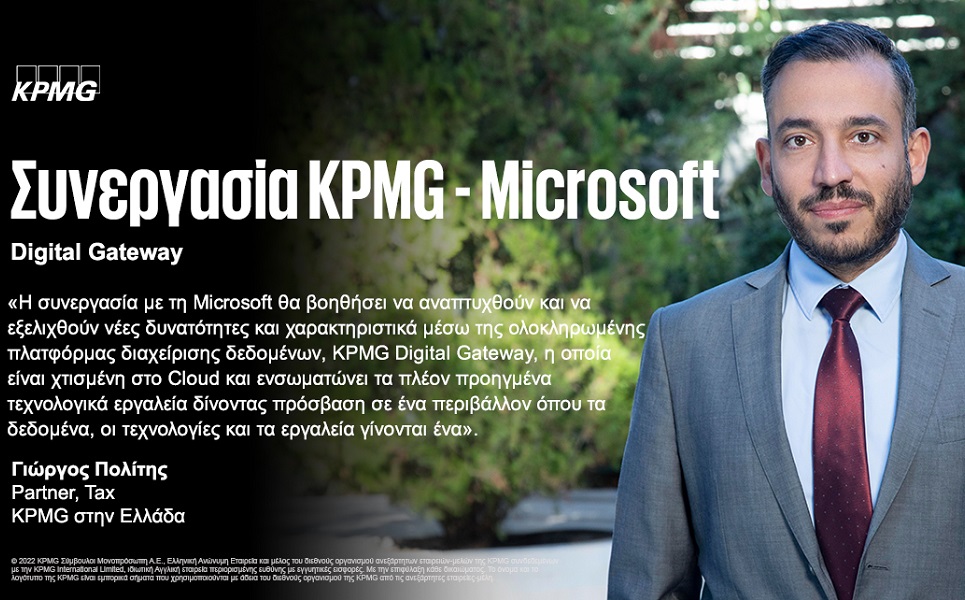 Τέλος, ο Γιώργος Πολίτης, Partner, Tax της KPMG στην Ελλάδα σχολιάζει επίσης «Κατά κάποιο τρόπο, τα δεδομένα είναι ένα ζωντανό και εξελισσόμενο περιουσιακό στοιχείο για την επιχείρηση το οποίο αν αξιοποιηθεί μπορεί να απελευθερώσει νέες ανεκμετάλλευτες ευκαιρίες για μείωση κόστους, δημιουργία νέων εσόδων και ανάπτυξης. Ξεκλειδώνοντας την αξία αυτών των δεδομένων, οι οργανισμοί μπορούν να ανακαλύψουν και να αποκτήσουν νέα ανταγωνιστικά πλεονεκτήματα. Η συνεργασία με τη Microsoft θα βοηθήσει να αναπτυχθούν και να εξελιχθούν νέες δυνατότητες και χαρακτηριστικά μέσω της ολοκληρωμένης πλατφόρμας διαχείρισης δεδομένων, KPMG Digital Gateway, η οποία είναι χτισμένη στο Cloud και ενσωματώνει τα πλέον προηγμένα τεχνολογικά εργαλεία δίνοντας πρόσβαση σε ένα περιβάλλον όπου τα δεδομένα, οι τεχνολογίες και τα εργαλεία γίνονται ένα».