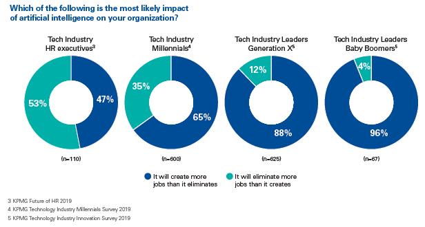 Στην έκθεση της KPMG επισημαίνονται οι διαφορετικές οπτικές που εκφράζονται από τα τμήματα Ανθρώπινου Δυναμικού και από τρεις γενιές επαγγελματιών και ηγετικών στελεχών του τεχνολογικού τομέα σχετικά με τον αντίκτυπο της ΤΝ στις θέσεις εργασίας. Μόλις το 47% των στελεχών Ανθρώπινου Δυναμικού στον τεχνολογικό κλάδο πιστεύει ότι η ΤΝ θα δημιουργήσει περισσότερες θέσεις εργασίας από αυτές που θα εξαλείψει, σε σύγκριση με το 65% των Millenials, το 88% των τεχνολογικών ηγετών της Γενιάς Χ και το 96% των τεχνολογικών ηγετών των Baby Boomers.