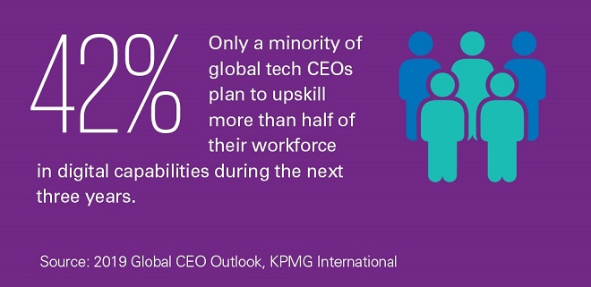 Παρά τις προσδοκίες για τον τρόπο με τον οποίο η Τεχνητή Νοημοσύνη (ΤΝ) θα επηρεάσει την εργασία, μόλις 42% των CEOs του τεχνολογικού κλάδου σχεδιάζουν κάποια αναβάθμιση των δεξιοτήτων για την πλειονότητα των εργαζομένων τους μέσα στα επόμενα τρία χρόνια, σύμφωνα με τη νέα έκθεση του 2019 της KPMG με τίτλο: «The future of HR in the technology sector (Το μέλλον του Ανθρώπινου Δυναμικού στον τομέα της τεχνολογίας)».