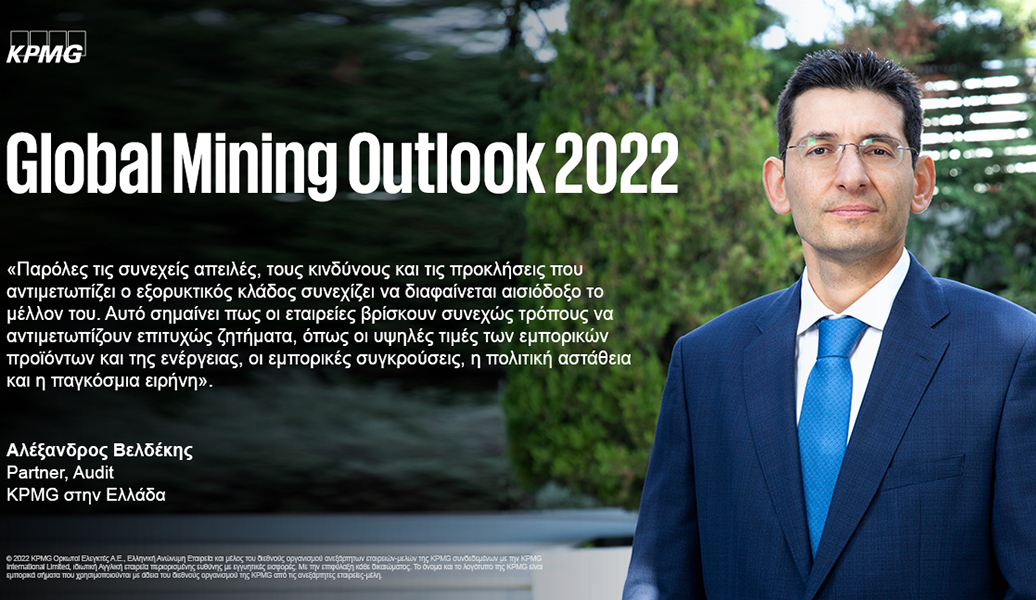 Ο Αλέξανδρος Βελδέκης, Partner, Audit της KPMG στην Ελλάδα με αφορμή την έκθεση αναφέρει «Παρόλες τις συνεχείς απειλές, τους κινδύνους και τις προκλήσεις που αντιμετωπίζει ο εξορυκτικός κλάδος συνεχίζει να διαφαίνεται αισιόδοξο το μέλλον του. Αυτό σημαίνει πως οι εταιρείες βρίσκουν συνεχώς τρόπους να αντιμετωπίζουν επιτυχώς ζητήματα, όπως οι υψηλές τιμές των εμπορικών προϊόντων και της ενέργειας, οι εμπορικές συγκρούσεις, η πολιτική αστάθεια και η παγκόσμια ειρήνη. Αυτό επιτυγχάνεται με το να προσαρμόζουν διαρκώς τα επιχειρηματικά τους μοντέλα, προχωρώντας σε νέες στρατηγικές συμμαχίες, σε άντληση νέων κεφαλαίων και στην ενσωμάτωση νέων τεχνολογιών για τη βελτιστοποίηση της παραγωγής τους και την ελαχιστοποίηση του κόστους τους. Επίσης τα τελευταία χρόνια οι εταιρείες έχουν μάθει να προσαρμόζονται στο να διαχειρίζονται γρηγορότερα και αποτελεσματικότερα τους νέους εξωγενείς κινδύνους που εμφανίζονται.