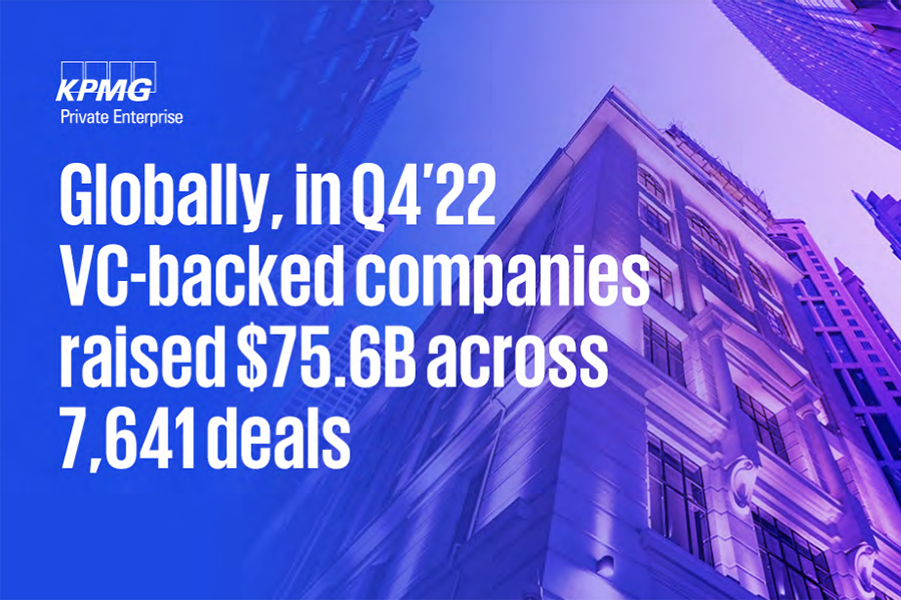 Σύμφωνα με την τελευταία έκθεση της KPMG “Private Enterprise Venture Pulse”, οι παγκόσμιες επενδύσεις επιχειρηματικών συμμετοχών υψηλού ρίσκου (Venture Capital – VC) σημείωσαν πτώση για τέταρτο συνεχόμενο τρίμηνο, το δ’ τρίμηνο του 2022 – από τα US$ 102,2 δισ. μέσω 9 767 συναλλαγών στα US$ 75,6 δισ. μέσω 7 641 συναλλαγών. Οι παγκόσμιες επενδύσεις έχουν πέσει στα χαμηλότερα επίπεδά τους από το β’ τρίμηνο του 2019.