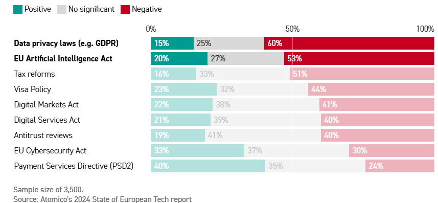 Ιδρυτές startups και επενδυτές κλήθηκαν να αξιολογήσουν τις επιπτώσεις βασικών νομοθεσιών της ΕΕ στις συνθήκες ίδρυσης ή ανάπτυξης εταιρειών. Η πλειονότητα των ερωτηθέντων ανέφερε ότι οι κανονισμοί για την προστασία δεδομένων και την τεχνητή νοημοσύνη δυσκόλεψαν την επιχειρηματική δραστηριότητα.