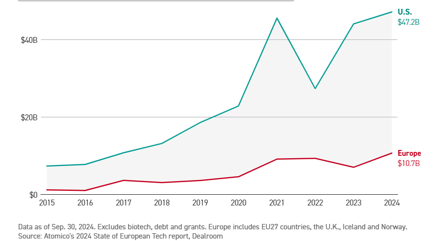 Οι ευρωπαϊκές εταιρείες τεχνητής νοημοσύνης συγκέντρωσαν 11 δισ. δολάρια σε χρηματοδότηση φέτος, σε σύγκριση με 47 δισ. δολάρια που συγκέντρωσαν οι αμερικανικές εταιρείες του κλάδου.