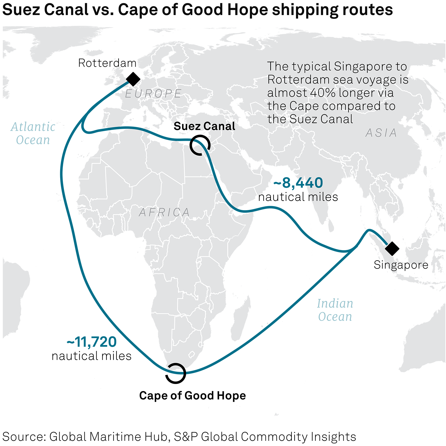 Η παγκόσμια κυκλοφορία θα ανακατευθύνεται τώρα γύρω από το Ακρωτήριο της Καλής Ελπίδας -ναυτιλιακές να στέλνουν τα πλοία τους γύρω από το Ακρωτήρι της Καλής Ελπίδας για να συνεχίσουν τα ταξίδια τους προς τους προορισμούς τους-, προσθέτοντας 40% στην απόσταση ταξιδιού.