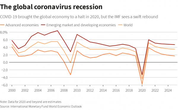 Όμως μέσα σε δύο μόλις μήνες, ένας μυστηριώδης νέος ιός που εντοπίστηκε στην Κίνα τον Δεκέμβριο του 2019 άρχισε να εξαπλώνεται ταχύτατα σε όλο τον κόσμο, θρυμματίζοντας αυτές τις προσδοκίες και προκαλώντας τη βαθύτερη παγκόσμια ύφεση εδώ και ολόκληρες γενιές. Το Διεθνές Νομισματικό Ταμείο εκτιμά ότι η παγκόσμια οικονομία συρρικνώθηκε κατά 4,4% στη χρονιά που πέρασε σε σύγκριση με τη συρρίκνωση του 2009, που είχε κινηθεί μόλις στο 0,1%, όταν ο πλανήτης βίωνε την πιο πρόσφατη οικονομική του κρίση.