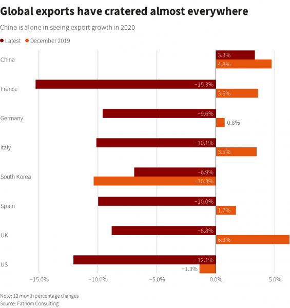 Όποια ανάκαμψη έχει σημειωθεί έκτοτε, οφείλεται κυρίως στην Κίνα, που είναι και η μοναδική από τις μεγάλες οικονομίες που είδε τις εξαγωγές της να αυξάνονται σε σχέση με πέρσι.