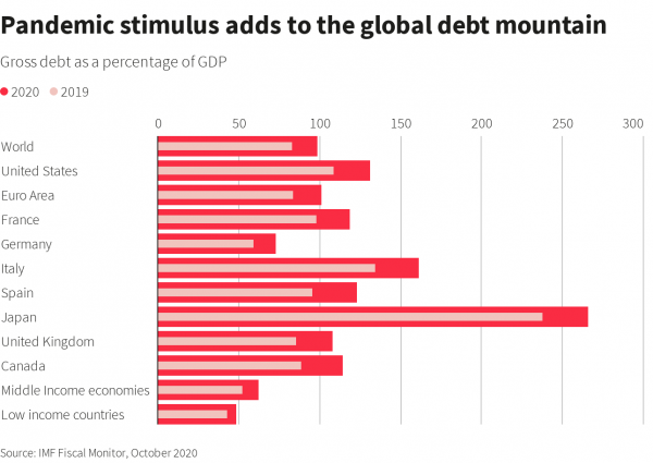 Πρωτόγνωρα επίπεδα κρατικής οικονομικής στήριξης προστάτευσαν τις οικονομίες από ακόμη μεγαλύτερη καταστροφή, αύξησαν όμως και τον ήδη τεράστιο όγκο του παγκόσμιου κρατικού χρέους, εγείροντας ερωτήματα για το κατά πόσον η επόμενη κρίση που θα πρέπει να αντιμετωπίσει ο πλανήτης θα σχετίζεται με την οικονομική στενότητα.