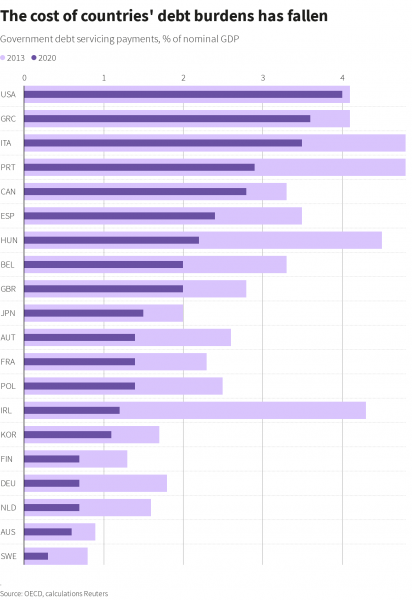 Ωστόσο, τα ιστορικά χαμηλά επιτόκια, που ορισμένες φορές κινούνται σε επίπεδα υπό του μηδενός, συνεπάγονται ότι τα κόστη εξυπηρέτησης των χρεών για τις οικονομίες των G7 είναι στα χαμηλότερα επίπεδα που έχουν κινηθεί μετά τη δεκαετία του 1970, όταν το βάρος του χρέους ήταν μόλις ένα θραύσμα του σημερινού του μεγέθους.