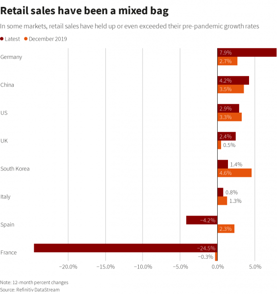 Ως αποτέλεσμα, οι πωλήσεις λιανικής σε πολλές οικονομίες έχουν αυξηθεί σε σχέση με πέρσι.