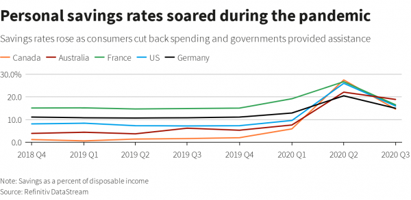 Μέχρι το τέλος του 2020, επέστρεψαν σε φυσιολογικά επίπεδα, όμως παραμένουν σημαντικά υψηλότερες σε σχέση με την περίοδο πριν την πανδημία. Ορισμένοι οικονομολόγοι πιστεύουν ότι η ύπαρξή τους θα είναι το προσάναμμα που θα πυροδοτήσει την αναθέρμανση της οικονομίας στη διάρκεια του 2021 και έπειτα, όταν πλέον τα εμβόλια θα επιτρέψουν την ευρύτερη ανάκαμψη και οι καταναλωτές θα αρχίσουν να κινούνται –και να ξοδεύουν- πιο ελεύθερα.