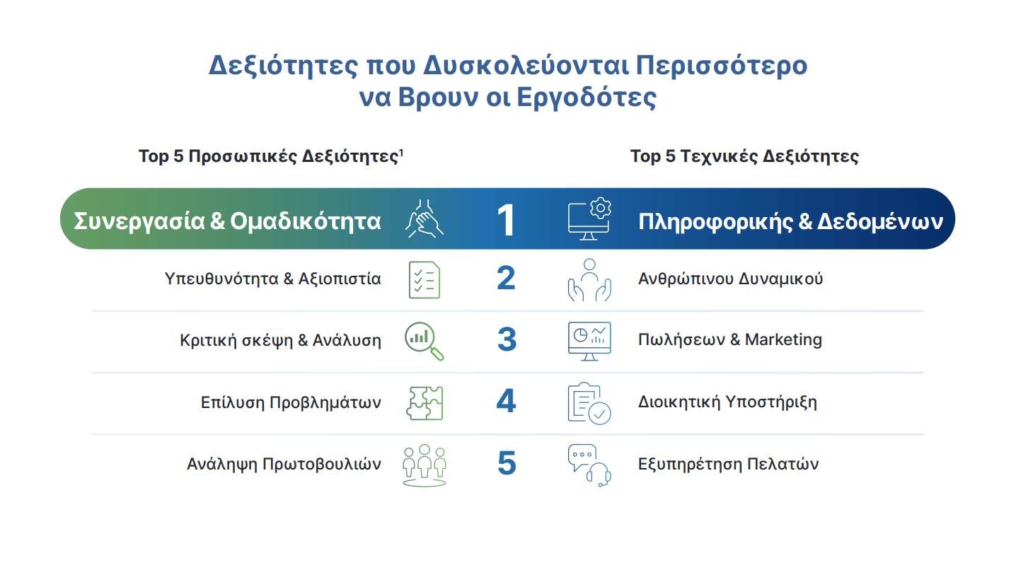 «Ανάμεσα στις τέσσερις πρώτες χώρες του κόσμου, μαζί με την Ιαπωνία, τη Γερμανία και το Ισραήλ, στις οποίες παρατηρείται υψηλότερο ποσοστό έλλειψης ταλέντων διεθνώς, βρίσκεται η Ελλάδα, καθώς το 82% των εργοδοτών στη χώρα μας δηλώνει σοβαρή δυσκολία να βρει εξειδικευμένα ταλέντα».