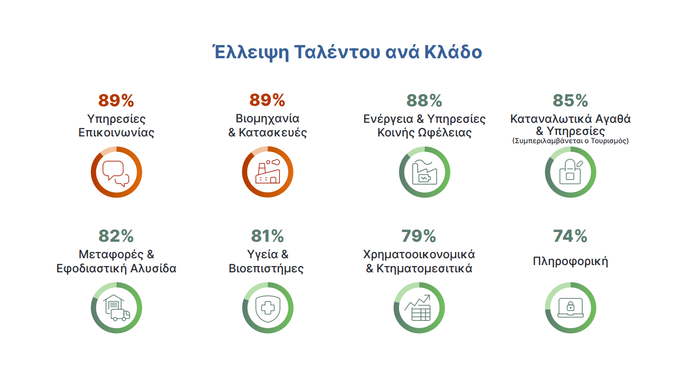 Με βάση τα στοιχεία της έρευνας, οι κλάδοι στους οποίους αποτυπώνεται μεγαλύτερη έλλειψη ταλέντου στην Ελλάδα είναι οι υπηρεσίες επικοινωνίας και ο κλάδος της βιομηχανίας & κατασκευών, με το 89% των εργοδοτών να αναφέρει δυσκολία στην εύρεση ταλέντων.