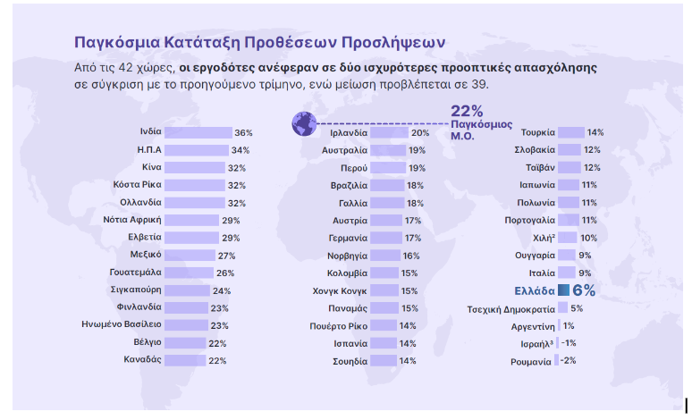 Η Ινδία (36%), οι ΗΠΑ (34%) και η Κίνα (32%) ξεχωρίζουν με τις πιο ισχυρές προοπτικές απασχόλησης παγκοσμίως.