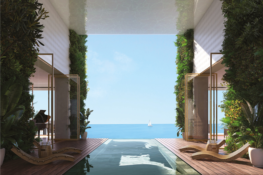 Αυτός ο πράσινος «φάρος», αρχιτεκτονικά, έγινε εφικτός µε τον σχεδιασµό πρακτικά δύο κτιρίων που τα συνδέει µια «σπονδυλική στήλη», όπου κυριαρχούν το πράσινο και το υδάτινο στοιχείο, κάθετοι κήποι και πισίνες. Εξάλλου, πέρα από την αισθητική, ο Marina Tower θα βελτιώσει την ποιότητα ζωής και τη βιωσιµότητα. Πλήρως εναρµονισµένο κτίριο µε τη θάλασσα και τα ιδιαίτερα χαρακτηριστικά του µεσογειακού τοπίου, ο πύργος κατοικιών Marina είναι ένα πρότυπο βιοφιλικού σχεδιασµού επόµενης γενιάς. Φέρει πιστοποίηση LEED Gold και Well being, δηλαδή είναι υπόδειγµα βιώσιµου σχεδιασµού.