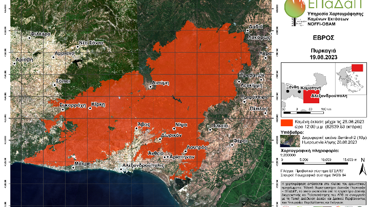 Έκταση μεγαλύτερη των 826.000 στρεμμάτων είχε κατακάψει η πυρκαγιά στον Έβρο έως τις 28/8 με βάση τις πιο πρόσφατες εικόνες υψηλής ανάλυσης του περιβαλλοντικού δορυφόρου Sentinel-2, που ανέλυσε η υπηρεσία χαρτογράφησης καμένων εκτάσεων του Εθνικού Παρατηρητηρίου Δασικών Πυρκαγιών (ΕπαΔαΠ), η οποία υλοποιείται από το εργαστήριο Δασικής Διαχειριστικής και Τηλεπισκόπησης του Τμήματος Δασολογίας και Φυσικού Περιβάλλοντος του ΑΠΘ.
