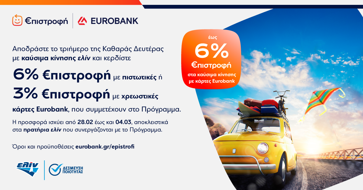 Από την Παρασκευή 28 Φεβρουαρίου έως και την Τρίτη 4 Μαρτίου, επιλέγοντας τα καύσιμα κίνησης ελίν, κερδίζετε έως 6% €πιστροφή με τις κάρτες Eurobank. Συγκεκριμένα: